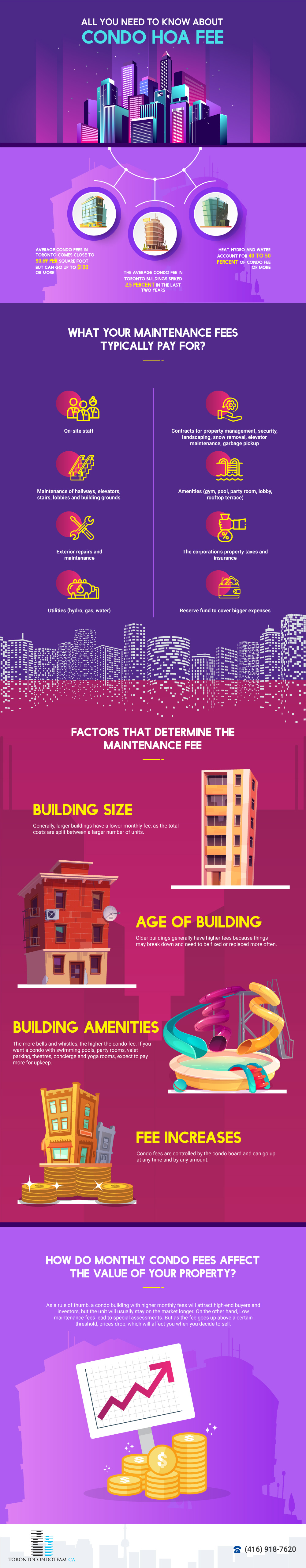 When condo shopping in Toronto, if you come across a beautifully kept condo with landscaped yards, flawless facade, gleaming interiors / exteriors, and renovated lobby's and they all seem to go together well – it’s all thanks to the Homeowner’s association! In other terms the Condo Board & managment company in place to manage the owners fee's. However, it all comes at a cost – Maintenance fee's pay for repairs, upkeep, structural repairs and improvements, as well as utilities, and maintenance of amenities, communal areas, elevators, and parking lot. The HOA also sets money aside for future projects and emergencies by building up a reserve fund. If you are thinking about investing in a Condo, here’s everything you should know about the HOA dues.