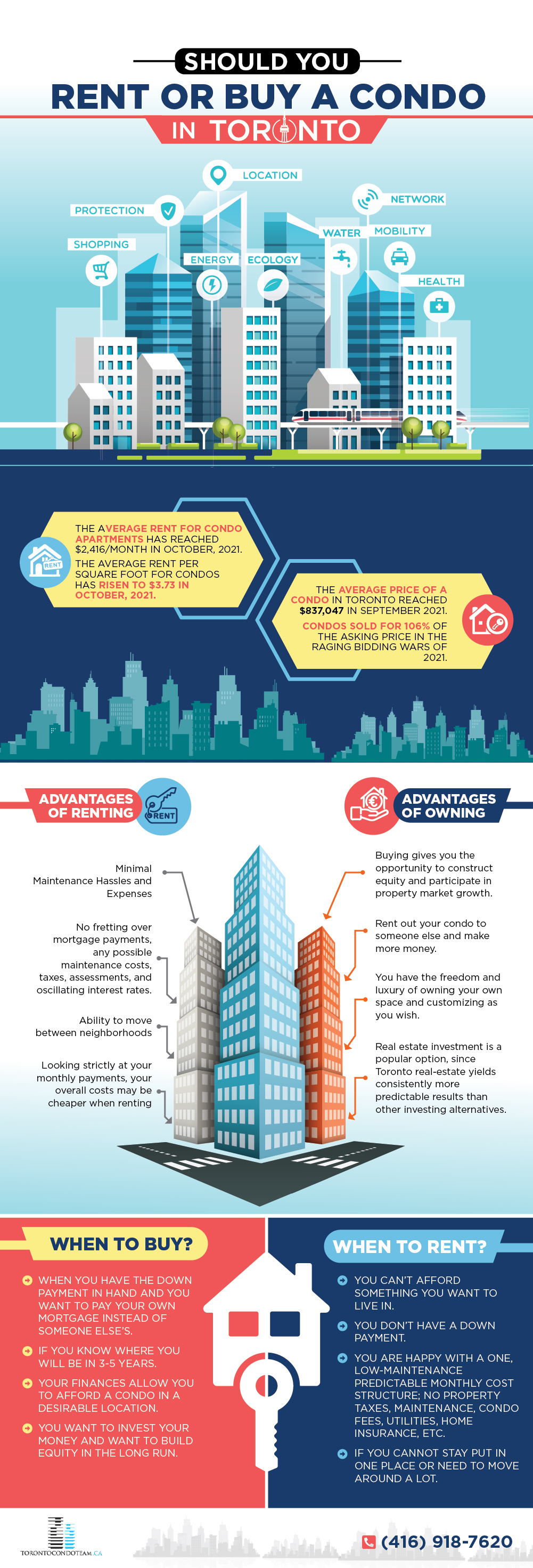 Tired of renting and moving from one condo to another? Thinking it might be a better idea to buy a property, that is if you can afford one in Toronto's red-hot housing market? The debate of renting vs. owning has been raging on for a long time, but there is no right answer. It all depends on your financial health, your requirements, and your circumstances. Is your life stable? Is your job stable? Is your employment stable? A lot of factors determine your real estate decisions. In the infographic below, we aim to compare the merits of both options to help you make an informed choice.